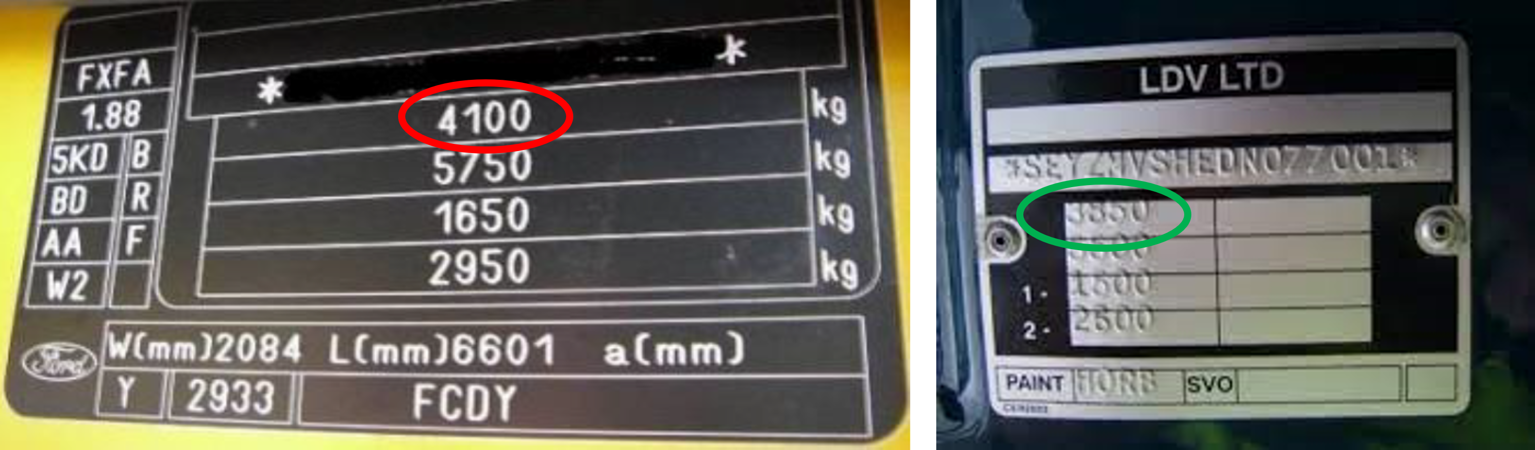 The plate on the left is on a standard (not wheelchair accessible) 17-seat Ford Transit minibus. It would be illegal for a driver with only category B entitlement to drive this minibus (4100kg MAM) as the MAM they can drive is 3500kg for a standard minibus, i.e. the plate on the right.